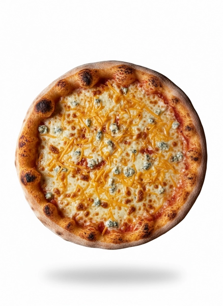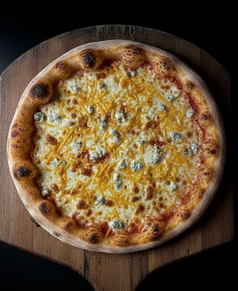 Pizza artesana congelada elaborada con base de masa tradicional, tomate, mozzarella, queso de rulo de cabra, queso azul y Cheddar.