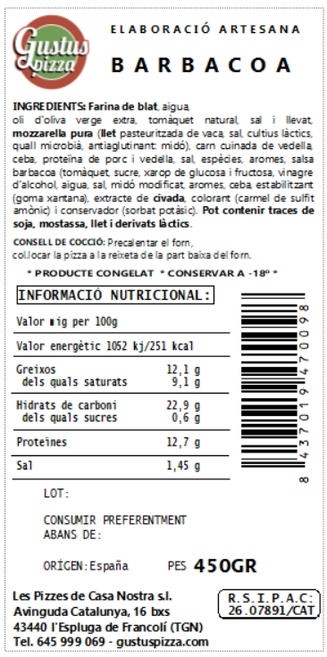 Base de pizza (harina de trigo, agua, aceite de oliva virgen extra, sal, levadura), tomate triturado natural, mozzarella, carne de ternera cocida y salsa barbacoa.