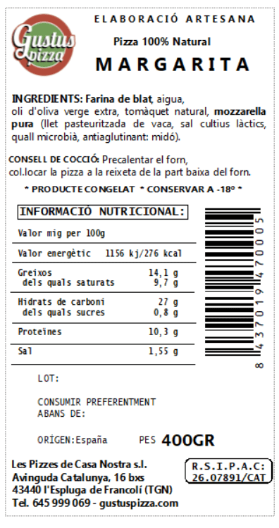 Base de pizza (farina de blat, aigua, oli d’oliva verge extra, sal, llevat), tomàquet triturat natural i mozzarella.
