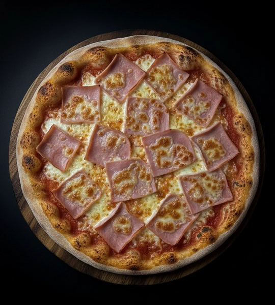 Pizza artesana congelada elaborada amb base de massa tradicional, tomàquet, pernil dolç i mozzarella.